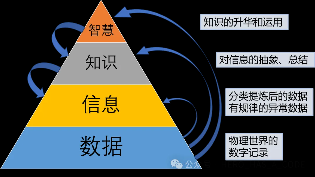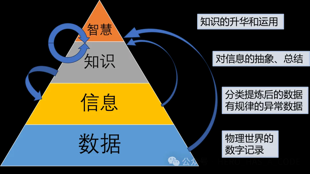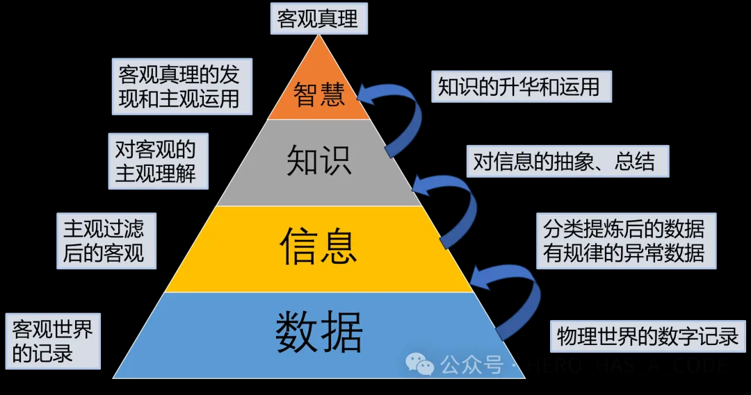 数据是信息的基础,信息是知识的原料,而知识则是智慧的基石。只有在充分理解并能应用知识的基础上,智慧才能显现。每个层级都在前一个层级的基础上增加了更多的意义、上下文和价值。
