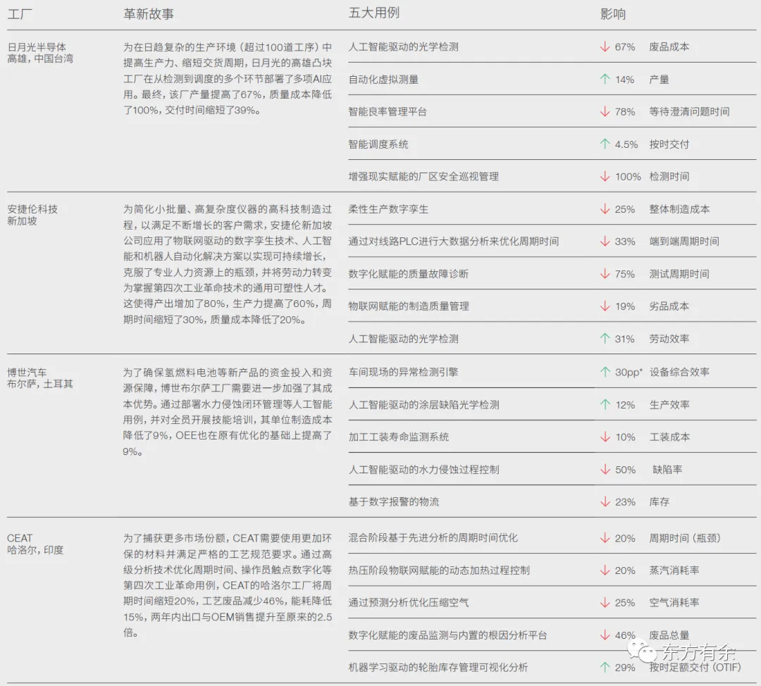 上海华谊新材料(中国,上海):为了应对30%的产能过剩和市场波动导致的成本上升等挑战,公司部署了28个4IR先进用例,例如机器学习驱动的流程优化和AI驱动的安全管理,成功使劳动生产率提高33%,单位加工成本降低20%,能源消耗降低31%,安全事故次数降至0。