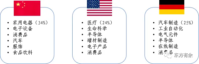 从当前132家“灯塔工厂”所属行业分布来看,覆盖电子设备、消费品、汽车、家用电器、制药、服饰、采矿、食品饮料等20多个领域。其中(以工厂所属企业国别来看),美国、德国的“灯塔工厂”集中于医疗、半导体、工业自动化、增材制造、生物技术等尖端制造行业,中国的“灯塔工厂”主要分布在贴近终端消费者的产业链下游,集中在家电制造、电子设备等离散型制造行业(具备多品种、小批量、工艺复杂等特点)。