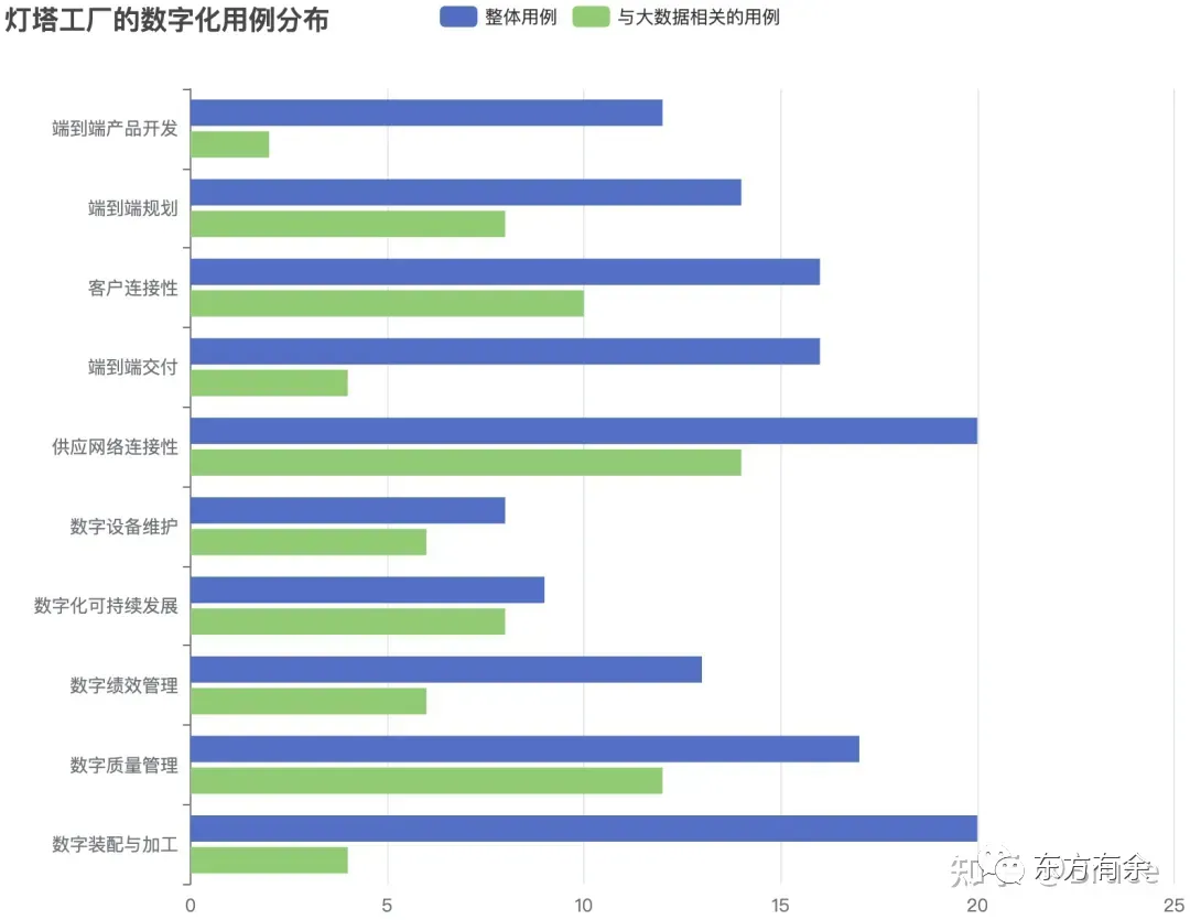 从灯塔工厂的数字化用例分布来看,每一分类中都有相应的大数据应用,意味着工业大数据的应用不再局限于良率管理、实时生产状态、设备维护等制造工艺方向,在端到端价值链方向中也有广泛应用。