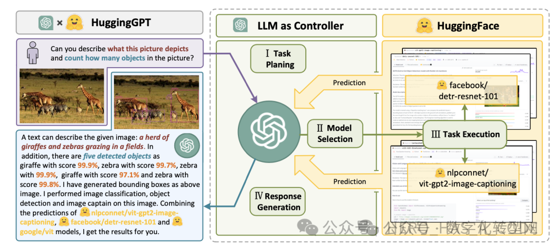 - 任务执行:使用第2步选择的模型执行的任务,总结成回答返回给ChatGPT;