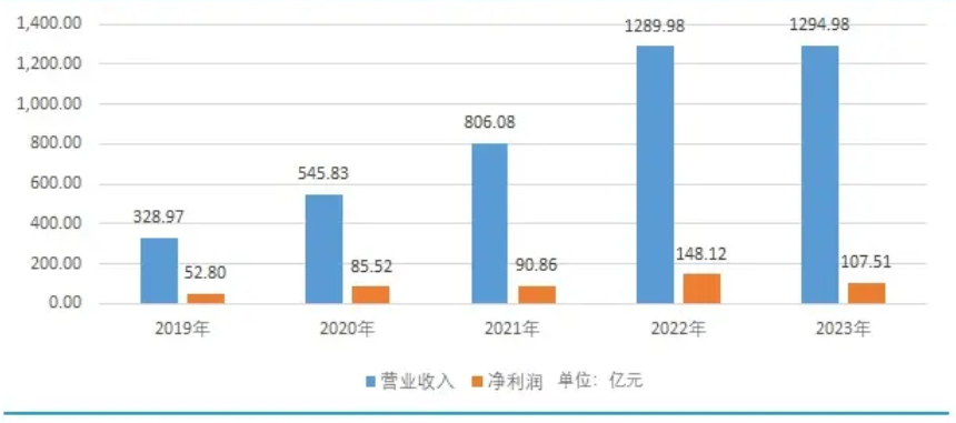 2022年,全年营收突破千亿元大关,达到了1289.98亿元,净利润也突破了百亿元大关,达到148.12亿元。