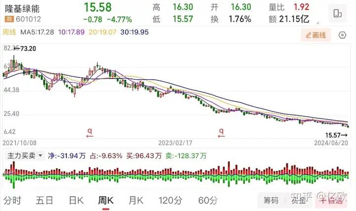 然而,上涨的好行情毕竟短暂,2022年下半年以来,隆基绿能便开启了下跌趋势,并一直下跌至今。