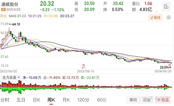 6月20日,光伏板块在经历大约一个月的震荡反弹后,开始掉头向下,板块集体下挫。除隆基绿能创下近4年新低以外,通威股份收盘价为20.32元,也创下了自2020年9月底以来的新低,市值逼近900亿元。