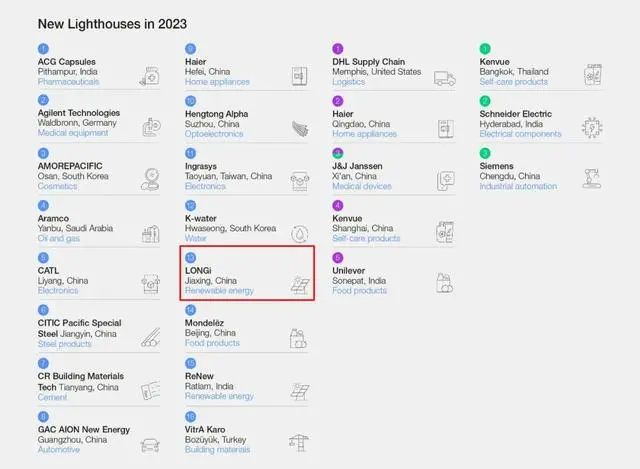 世界经济论坛(WEF)公布最新一批“灯塔工厂”名单,21位新成员加入其全球灯塔网络。隆基绿能嘉兴基地是全球光伏行业唯一入围工厂。