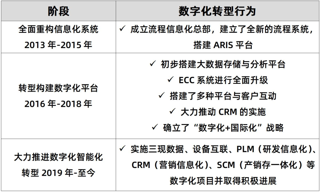 2. 流程四化,即业务流程分析重构,实现标准化、在线化、自动化和智能化。聚焦从概念到产品、线索到回款、订单到交付、问题到解决四大主线。比如在研发、计划、商务、制造、物流等方面自主开发多款软件,推动制造、供应链、采购、研发、营销等软件运用与优化迭代,关键是将标准流程固化。