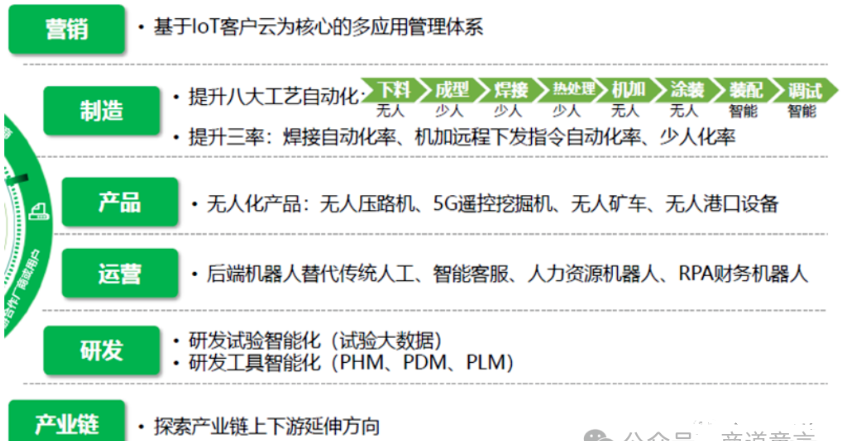 三一重工在数字化转型方面,注重从营销环节、制造环节和运营环节入手,采取了一系列措施。
