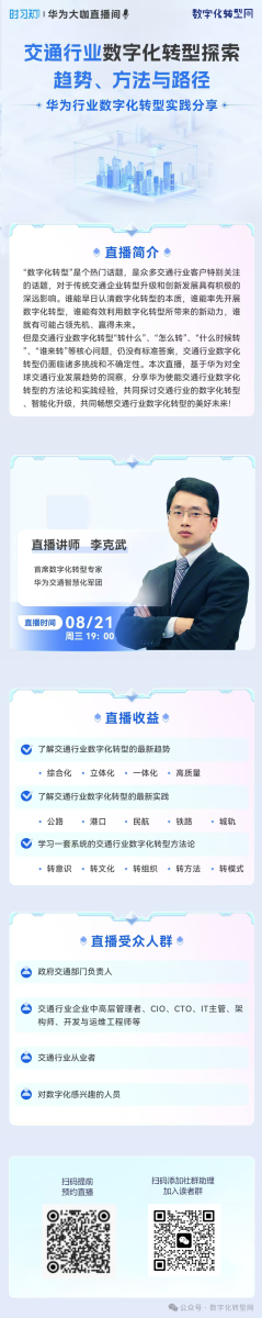 在直播里,李克武老师将基于华为对全球交通行业发展趋势的洞察,分享华为使能交通行业数字化转型的方法论和实践经验,共同探讨交通行业的数字化转型、智能化升级,共同畅想交通行业数字化转型的美好未来!