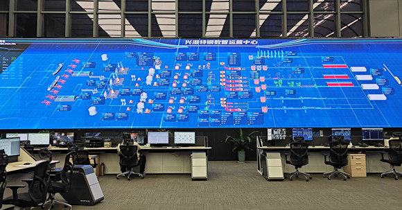 兴澄特钢厂区的数智中心大楼,可以称得上是这座钢铁工厂的大脑。位于大楼二层的运营管控中心,一块巨幅显示屏展示着这座工厂从原料码头、炼铁、炼钢到轧钢的全流程图景,可以了解到各个生产环节的实时数据。