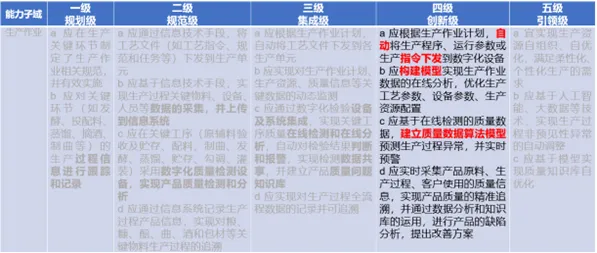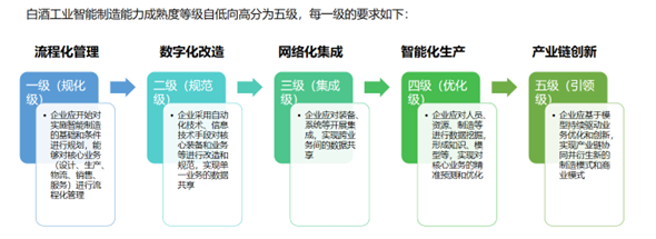 以《智能制造成熟度评价 白酒工业智能制造成熟度评价实施指南》团体标准的研究成果为例,本项研究参考国标《智能制造能力成熟度模型》、《智能制造能力成熟度评估方法》,研制了《白酒工业智能制造能力成熟度评价实施指南》团体标准,通过该标准可以对白酒工业的智能制造成熟度水平进行评估。从而帮助主管部门了解行业智能制造发展水平总体情况,看清与先进制造业存在的差距,为制定政策提供数据参考;帮助酿酒企业全面了解自身智能制造能力成熟度水平,“把脉问诊”,定位薄弱环节,找出智能化提升的问题点和改进方向;帮助供应商更有针对性的提供白酒行业智能化改造所需的专业化、定制化软硬件产品和改善解决方案。数字化转型网www.szhzxw.cn