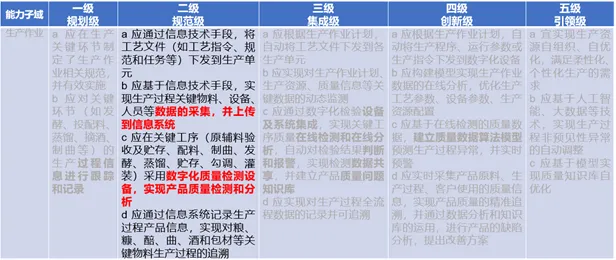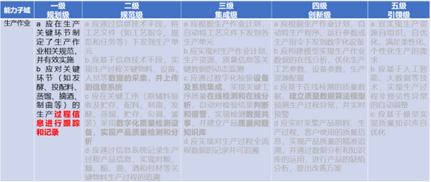 企业案例:XX公司配置了一整套酿造环节质量参数的在线感知硬件设备,记录每个关键工艺环节理化参数值,构建投配料自主决策模型,配合后续工序的自动摘酒、自动分级入库数学模型,建立投配料和出酒率、优级酒率之间的数量关系;固化形成基于不同参数状态值的、可动态调整的投配料决策建议簇;与MES系统打通,由MES系统直接下达决策建议对应到每个工艺执行环节……(完全满足生产作业三级a、b、c,已基本达到四级a、b、c 条款要求)