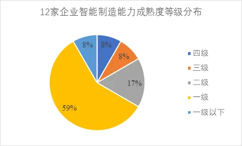 为方便企业对自身智能制造发展水平进行自测评估,课题组设立了白酒行业智能制造能力成熟度调查问卷,问卷共分为5个级别,每级问卷约30-50题,以发送问卷链接的形式邀请各白酒生产企业进行了问卷填写。问卷完成后,课题组会为各企业提供了一份成熟度初步自测评估报告。目前已有十二家企业进行填写并得到反馈。通过对12家酒企智能制造成熟度评价数据的统计分析发现:多数白酒企业智能制造成熟度水平在一级及以下,处于较低等级。数字化转型网www.szhzxw.cn