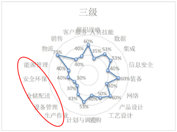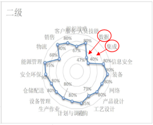 下图为S公司在不同等级的能力子域得分程度,一级得分程度均在80%以上,二级得分程度在80%以上的能力域有14个,其中有9 个能力子域得分程度为80%,即刚符合要求,还有待继续提高,数据和集成在二级中得分程度分别为47%和40%较为薄弱,需特别关注。三级能力子域得分程度都在80%以下,也即未达到三级水平。数字化转型网www.szhzxw.cn