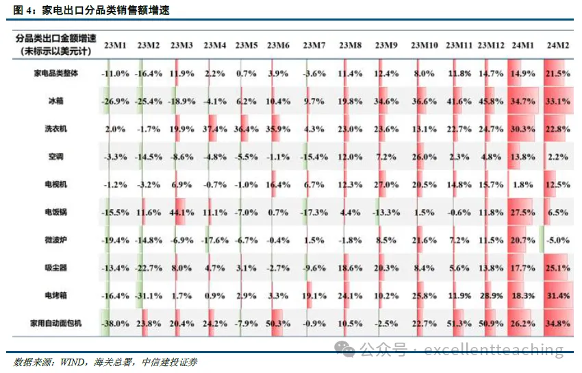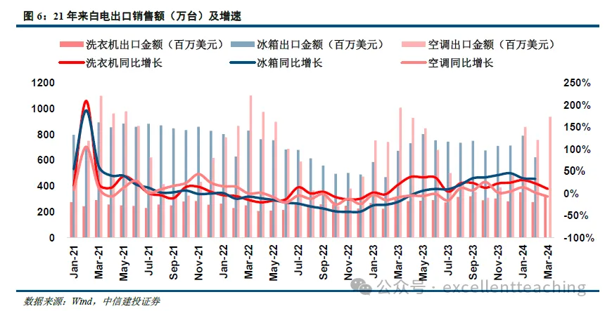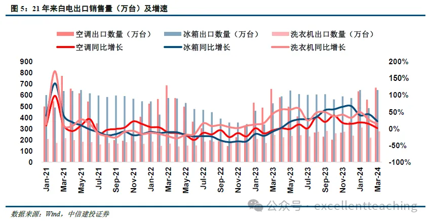 总体上与家电整体出口表现趋势一致,2023 年上半年以来,白电板块逐渐恢复正增长,下半年增速进一步提升,冰洗空三大板块出口销售量均实现了双位数增长。具体而言,冰箱品类出口出口销售量为 23 年 4 月开始转正(出口销售额为 23 年 5 月);23 年 3 月洗衣机品类出口销售额由负转正,此后出口销售额与销售量均维持较快增长;空调销售量增速从 23 年 6 月开始转正(销售额为 8 月)。24 年延续积极表现,海关数据显示,24 年1-2 月空冰洗出口额同比增速分别为+11.5%/+38.3%/+31.0%。
