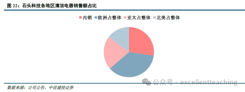 以出口绝对金额最大的扫地机龙头石头科技为例,欧美为其主要出口市场,2023 年欧洲市场约占外销的 50%,北美市场约占 20%,亚太市场约占 30%。