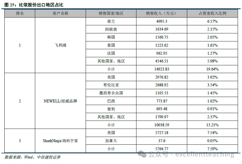 以厨房小家电为例,根据国内小家电代工龙头品牌新宝股份的招股书数据显示,公司厨小电品类的出口地区分布中,主要集中于欧洲、北美、亚洲等地占比还相对较低。与新宝类似,主营空气炸锅代工的比依股份,其头部客户出口市场也基本集中于欧美等国家。