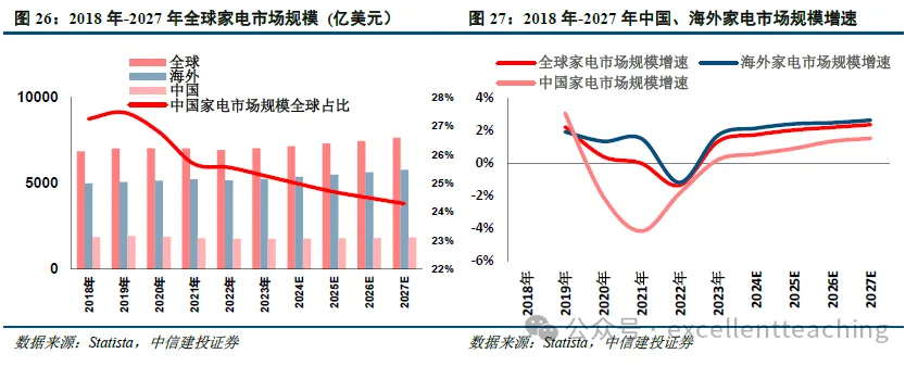 国内市场规模仅占全球家电市场规模的1/4,全球占比持续下降。Statista 数据显示,2022 年全球家电市场收入规模达 6943.20 亿美元,其中中国家电收入为 1774.34 亿美元,占全球市场收入的 25.56%,国内仅占全球家电消费量的 1/4。预计到 2027 年全球市场规模将达到 7645.48 亿美元,中国市场规模将达到 1857.14 亿美元。2021 年-2027 年预计中国家电市场规模全球占比逐年下降,外销市场的绝对空间充足。
