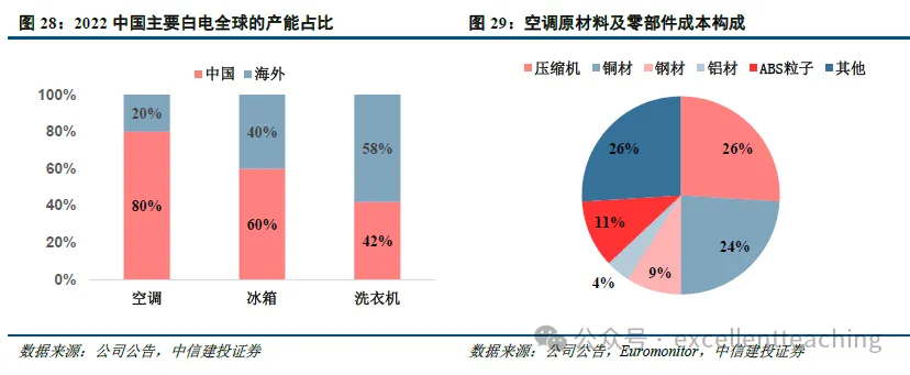 以空调为例,国内美的、海尔、格力等龙头品牌在空调产业链中游提供整机组装业务。包括美的、海尔、格力在内的一众厂商经过多年深耕,在上游零部件和原材料上实现近 100%国产自给。中国白电企业具有规模一体化生产优势。其中,压缩机主要生产厂商有美的、海立;冷凝器、蒸发器主要生产厂商有美的、海尔、格力;电子膨胀阀主要生产厂商有盾安环境;电机主要生产厂商大洋电机;其他零部件如温度控制器,LED 显示,空气过滤网等同样实现 100%国产化。另外在原材料上,白电龙头依托规模化优势,在钢材、铝材、铜材以及塑料(ABS)采购方面可有效压减成本。