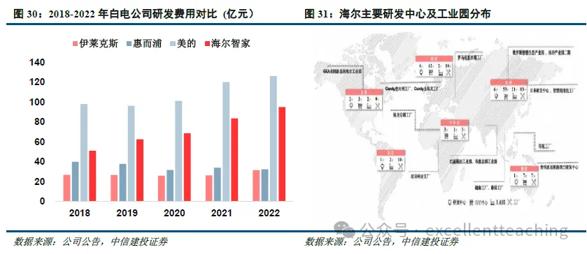 除此之外,中国家电企业还持续推进降本增效,创新推新,发挥全球化研发协同优势,创新驱动带来的高产品力叠加创新与规模化生产带来的性价比优势,帮助中国家电企业在海外家电市场的竞争中更好地胜出。近年来中国三大龙头白电企业研发投入强劲、投入规模逐年扩大,2018-2022 年,较惠而浦、伊莱克斯、大金工业等世界其他龙头企业,美的、海尔集团的研发投入明显较高。中国三大龙头白电企业通过并购和自身建设构建了囊括研发、采购、生产制造、销售等多环节的全球化体系。截至 2023 年,海尔在全球已拥有“10+N”大研发中心、25 个工业园、122 个制造中心、108 个营销中心。格力公司在国内外建有 77 个生产基地,16 个研究院,美的集团在全球 12 个国家设有 35 个研发中心,形成“2+4+N”全球化研发网络。全球化研发协同,整合全球人才、技术、设施和资金等研发资源,多元化创新提升产品力。