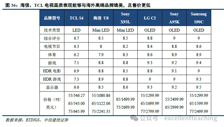 性价比:1)性能:国内品牌技术创新升级,产品性能明显提升。海信对 ULED 感知画质技术平台持续升级, TCL 量子点+Mini LED 技术成熟度领先,海信 UX、TCL X11G 等新品的分区数、色域、亮度、反射率显著提升,产品力达到海外高端品牌水平。2)价格:得益于国内供应链及制造成本优势,国内品牌产品的成本及售价更低,凭借性价比优势畅销国内外。