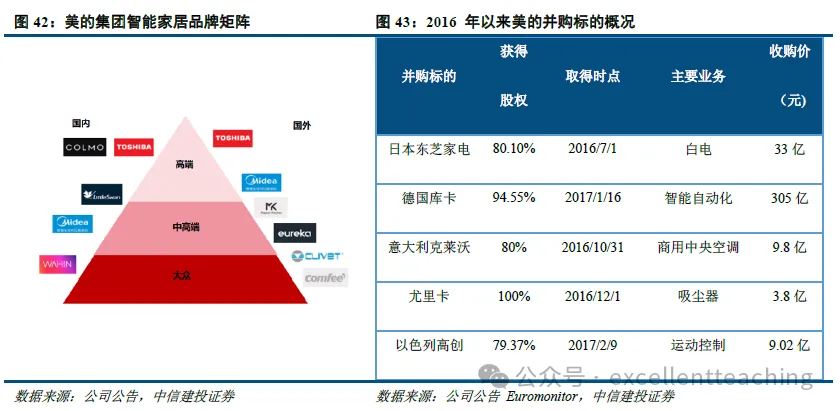 比如海尔智家从 2015 年开始先后收购了集团白电资产、三洋白电资产、GEA、Candy 等,依靠国内消费市场及供应链优势为被收购企业赋能,输出组织管理,在完善了面向不同消费市场的品牌矩阵的同时吸取了原有品牌的技术经验,从而完成了海外品牌与渠道布局,进一步加强竞争力。