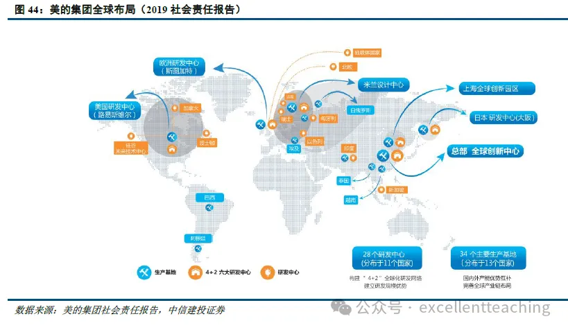 目前美的不断拓展海外制造能力布局。截止目前,公司在海外 9 个国家设立 16 个研发中心,在越南、白俄罗斯、埃及、印度、巴西、阿根廷、泰国、意大利和日本等 13 个国家拥有 21 个生产基地,3 万多名海外员工,全球业务覆盖 200 多个国家和地区。