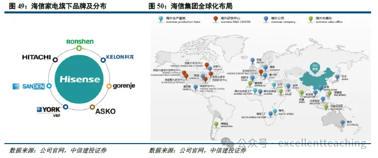 海信家电作为白电龙头,积极布局出海,自 2006 年确立海信的未来“大头在海外”战略以来,海信在海外市场不断发展,打造国际化知名品牌,发挥多品牌、多品类协同效应,目前已实现白电业务多品牌全球布局,在白电领域,目前公司拥有海信、科龙、容声、日本“HITACHI(日立)、美国“YORK”(中国区域)、欧洲高端家电品牌 Gorenje 集团及其旗下 ASKO 等七大品牌。同时公司通过持续参与集团体育营销,充分利用大型体育赛事提升品牌推广效率,积极拓展客户、拓宽渠道,各子品牌海外知名度和影响力不断提升。