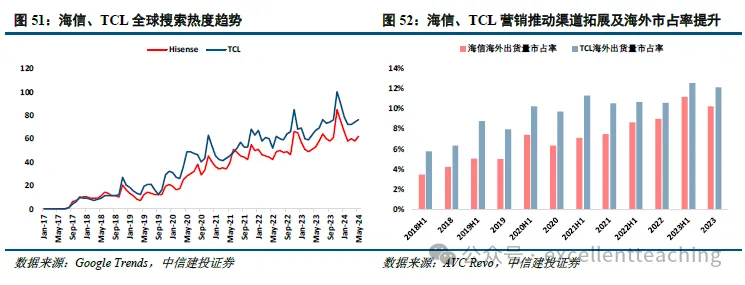 自主品牌:海信+TCL 品牌出海,通过品牌营销推动渠道拓展,海外市占率逐年提升。