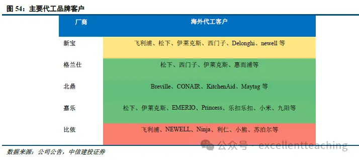 基于完善的产业 链以及相对较低的生产制造成本、更快的响应 速度,国内已经形成诸多有较强全球竞争力的厂商,比如新宝、格兰仕、北鼎、嘉乐、比依、天喜、莱克、富佳等,基于自身强有力的生产制造优势,为全球家电品牌提供小家电产品。