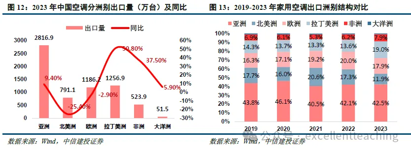 空调品类:亚洲、欧美市场为主,新兴国家快速起量。从份额占比上看,亚洲/北美洲/欧洲/拉美/非洲/大洋洲空调出口额占比分别为 42.5%/11.9%/17.9%/19.0%/7.9%/0.8%。2023 年欧美市场表现疲软,分别同比下降25.4%及 2.9%;拉丁美洲、非洲增速较快,分别 50.80%及 37.5%。