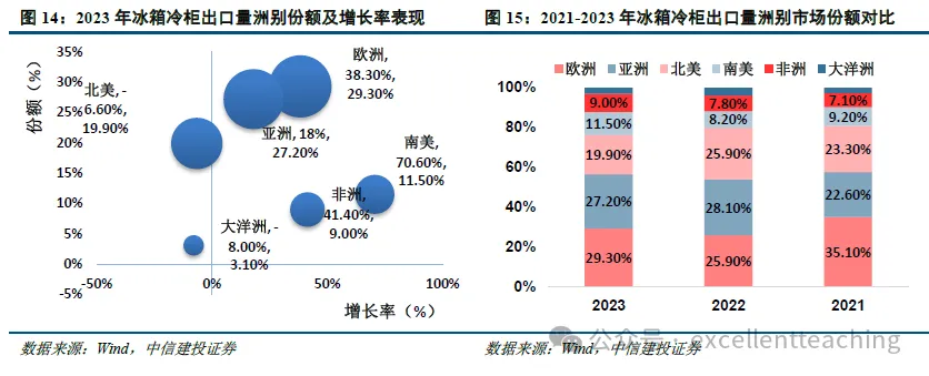 冰箱冷柜品类:欧、亚、美为前三大市场,分布相对均衡。2023 年欧洲/亚洲/北美/南美/非洲/大洋洲出口额占比分别为 29.3%/27.2%/19.9%/11.5%/9.0%/3.1%。北美、大洋洲出口走弱,分别同比下降 8.00%和 6.60%;其余各洲出口均维持增长,拉美增速高达 70.6%,非洲和欧洲同比增速分别达到 41.4%和 38.3%。
