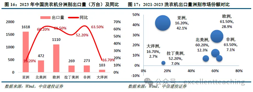 洗衣机品类:亚洲为第一大市场,欧美需求恢复。2023 年亚洲/北美洲/欧洲/拉美/非洲/大洋洲出口额占比分别为 42.1%/12.3%/28.9%/7.0%/7.1%/2.7%。除亚洲、大洋洲增长偏慢,其余各区域均有明显提升,欧美表现尤为突出,增速均超过 60%。