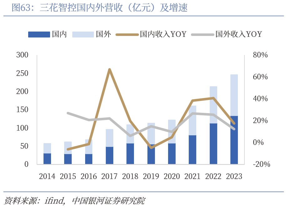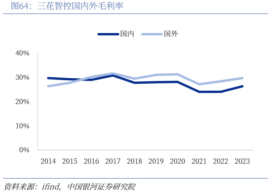 三花智控海外收入占比约50%,毛利率略高于国内。过去十年,三花智控海外营收从2014年的25.05亿元增至2023年的111.54亿元,海外营收约占总营收的一半,2023年海外营收占比为45.42%,公司国际化水平较高。随着规模效应逐步显现,三花智控国内外毛利率持续提升,且海外毛利率高于国内,2023年内外销毛利率分别为26.33%和29.77%。未来随着针对当地环境逐渐做出调整,持续降本增效,盈利能力有望稳中有升。
