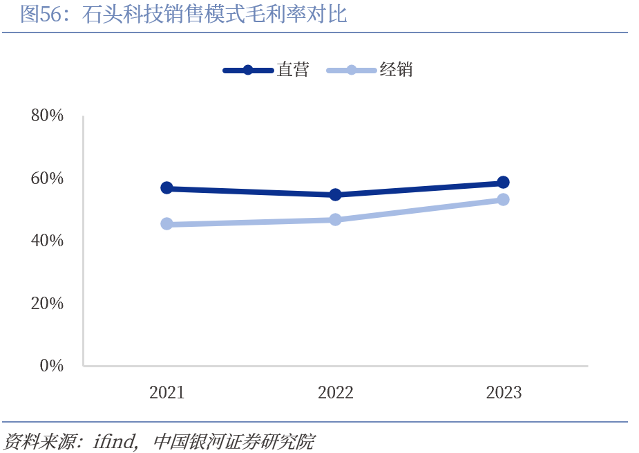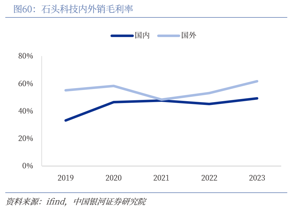 石头科技海外业务占据半壁江山,渠道直营叠加硬件降本提振毛利率。石头科技海外收入从2019年的5.81亿元跃升至2023年的42.29亿元,年复合增长率达64.25%,整体增速快于总营收,海外市场拓张迅速,构筑第二成长曲线。受益于欧美客户消费能力强,公司海外中高端扫地机产品力优势明显,把握产品溢价权,叠加线上渠道收回转为自营,石头科技海外毛利率高于国内,2023年外销毛利率为61.65%。未来随着直销模式占比继续增大,海外盈利能力或将进一步提升。石头科技充分利用技术研发优势,推动产品降本,通过升级SLAM算法等软件能力,选用低性能硬件也能实时输出定位和地图信息,并对产品再设计,从硬件应用端节省成本,保证性能的基础上实现降本。