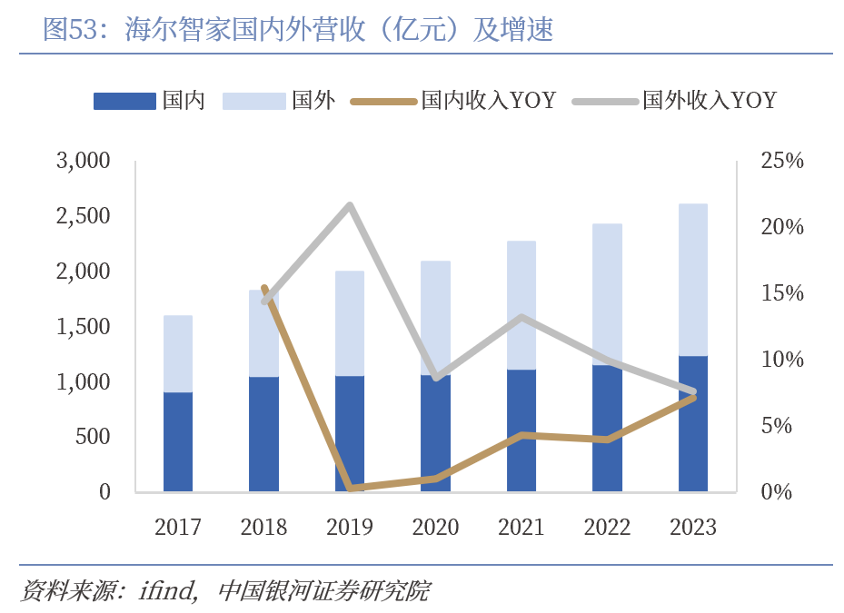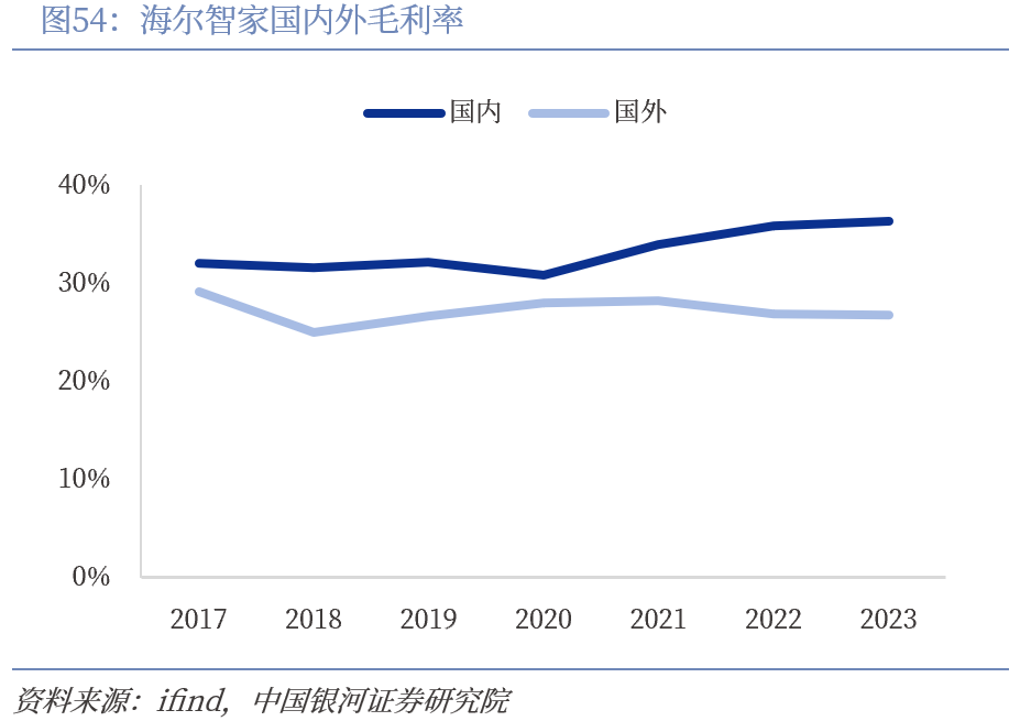 海尔海外收入占比过半,国际化赛道持续发力。近几年海尔智家海外扩张明显,外销收入增速显著快于内销,海外收入从2017年的670.40亿元跃升至2023年的1356.78亿元,贡献度由42.24%提升至51.90%,国际化发展效果明显。受海外渠道布局扩张成本较高影响,2023年海尔智家外销毛利率为26.77%,与卡萨帝品牌加持下的内销毛利率有一定差距。未来随着海外业务布局日益成熟,品牌附加值逐步提升叠加公司产品高端化战略深入推进,海外盈利能力有望提高。