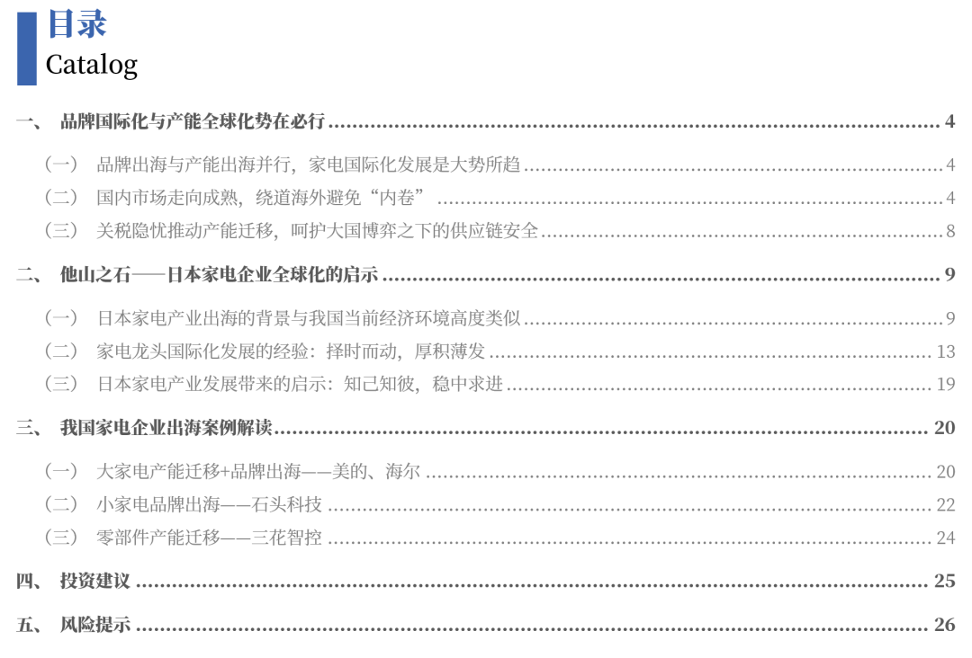 他山之石——日本家电企业全球化经验带来的启示。我国家电发展环境与上世纪80到90年代的日本非常相似,通过总结日本家电龙头企业的国际化发展经验,我们发现三大关键因素影响家电企业出海质效:1)企业自身具备产品、技术、制造和渠道等多方面优势,能够以较高的产品附加值和品牌附加值构建业绩护城河;2)企业能够根据自身产品和目标市场不同的需求、格局、政策等因素制定差异化的出海战略;3)将产能迁移、吸收并购和品牌本土化经营三大主要出海手段有机结合。此外,考虑到我国本土家电市场潜力远超日本,且国际贸易形势较彼时已发生了较大变化,企业出海时仍需保障本土核心产能和供应链安全。