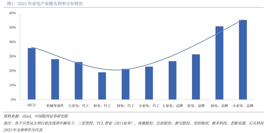 家电产业链价值呈现“微笑型”分布,品牌出海和产能出海是必然趋势。从家电产业价值分布角度来看, 2023年大家电、彩电、厨电、小家电企业品牌厂商销售毛利率分别为26.5%、31.3%、50.7%、55.1%,均高于其代工业务销售毛利率(对应分别为25.9%、18.8%、21.2%、22.7%),品牌厂商享受一定溢价。由于海外发达市场的家电产品售价更高,品牌厂商为了追求更广阔的溢价空间,纷纷通过赴外建厂,收购当地品牌等方式进入欧美等发达国家市场,通过多元化的营销和渠道拓展手段提高市占率,并借助海外市场取得的成果打造国际化形象,反哺国内品牌建设。上游核心元器件方面,MCU等电子元器件毛利率在30%以上,以空调压缩机、制冷阀为代表的机械零部件企业的销售毛利率为27.9%,均高于家电代工企业。处于产业中间环节的代工业务毛利率相对较低,企业为了配套其下游客户的全球化产能布局,逐步向能够辐射欧美市场的南美、东南亚等发展中国家及地区迁移,借助当地低廉的劳动力、土地等生产要素扩大规模效应。
