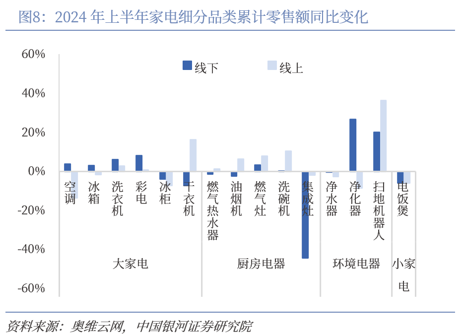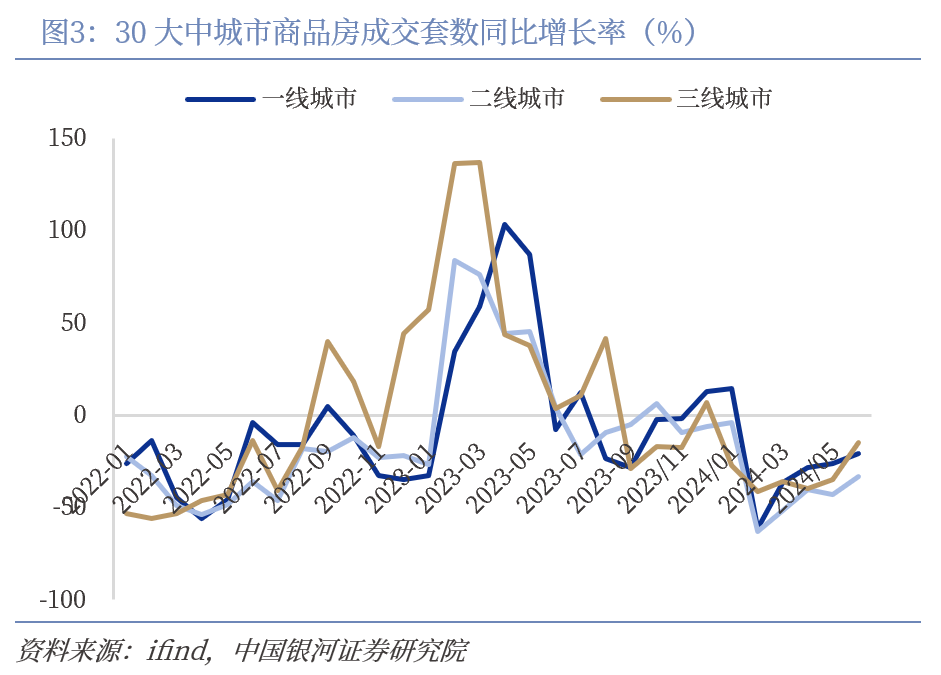 地产端仍显弱势,家电增量需求不振。根据统计局数据,2024年1-6月房地产住宅销售面积累计达40114.18万平方米,同比减少21.90%。竣工端来看,截至6月住宅开工面积累计达27747.84万平米,同比下滑23.6%;竣工面积累计达19259.01万平米,高基数影响下,同比减少21.8%。从30大中城市商品房成交数据来看,2024年6月份,30大中城市商品房成交套数同比减少24.19%,其中一线、二线、三线城市成交套数同比分别下滑21.08%、33.19%、14.65%,尽管降幅环比有所收窄,但仍显弱势。作为地产后周期,过去家电增量需求与新房购置、二手房翻新等场景高度绑定,地产端弱势背景下,家电增量需求疲弱。