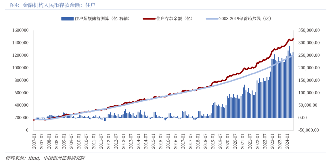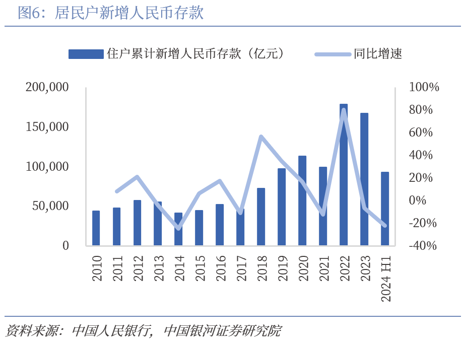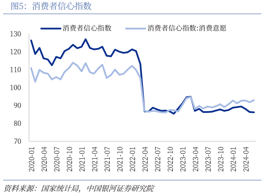 居民超额储蓄仍在增长,消费信心仍显不足。根据中国人民银行数据显示,截止2024年6月,人民币存款余额为146.26万亿元,较年初增长6.77%,同比增长10.60%,6月住户超额储蓄测算值为26.13万亿元,同比增长7.36%,超额储蓄规模庞大,蕴含着巨大的消费潜力。2024年二季度城镇储户问卷调查报告,2024年第二季度倾向于“更多储蓄”的居民占61.5%,比上季度减少0.2个百分点,倾向于“更多消费”的居民占城镇储户的25.1%,比上季度增加1.8个百分点居民消费意愿仍在筑底。