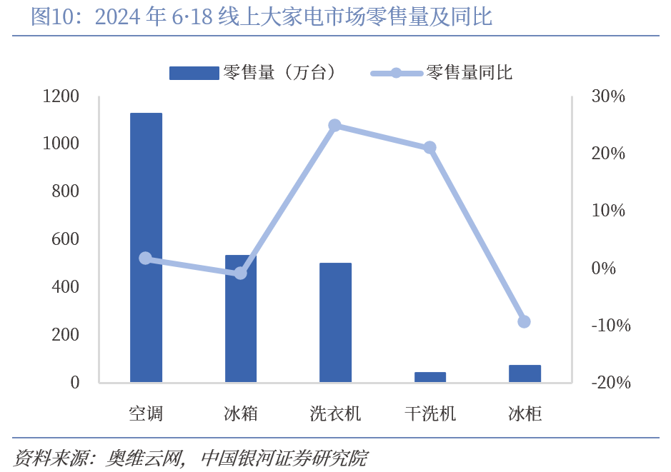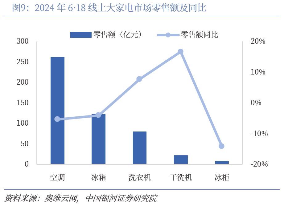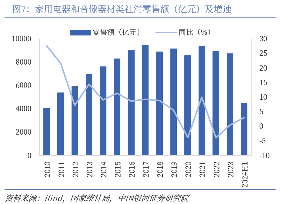 家电内销复苏斜率相对平缓,需求不足背景下,厂商以价换量加剧行业竞争。根据统计局数据,2024年上半年家用电器和音像器材类社会消费品零售总额4487.40亿元,同比增长3.10%,增速较2023年全年提升了2.6个百分点,但复苏仍显疲弱。根据奥维云网推总数据,2024上半年白电市场零售额2319亿元,同比下滑7.0%,零售量7774万台,同比下滑3.6%,零售额降幅显著高于零售量。618白电线上市场零售量2271万台,同比增长5.2%,零售额490亿元,同比下降2.5%,其中空调线上均价为2604元,同比下滑6.9%。消费降级叠加价格战影响,整体市场呈现以价换量的趋势。