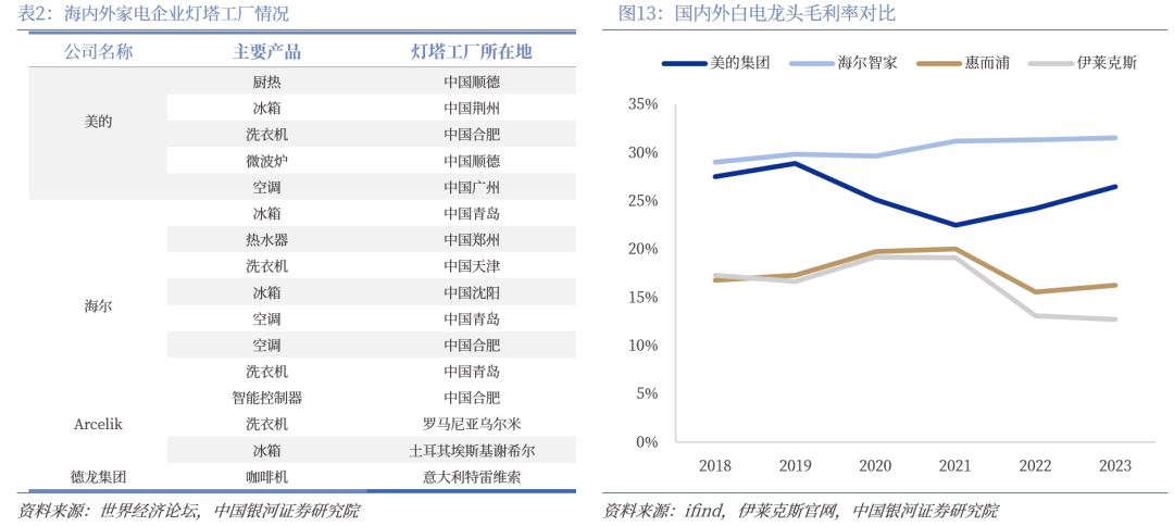 国内家电产业在数字化与工业 4.0 实践方面领先,规模效应显著。对比海外家电企业,国内家电企业背靠丰富且集中的供应链、领先的数智化工厂,已具备较强的规模优势,生产成本和效率更具优势,规模效应明显。我国家电产业在数字化与工业 4.0 实践方面领先,根据2023年12月14日世界经济论坛评选的第十一批灯塔工厂名单,全球累计共有153座灯塔工厂,其中中国有62座,占比达41%。国内62座灯塔工厂中,美的、海尔分别拥有5座和8座,智能化改造赋能家电制造,规模优势持续显现。2023年国外白电龙头如惠而浦、伊莱克斯等毛利率普遍低于 20%,而我国白电龙头海尔、美的等毛利率在 25%-30%之间,卡萨帝品牌高端化赋能之下的海尔毛利率超过 30%。