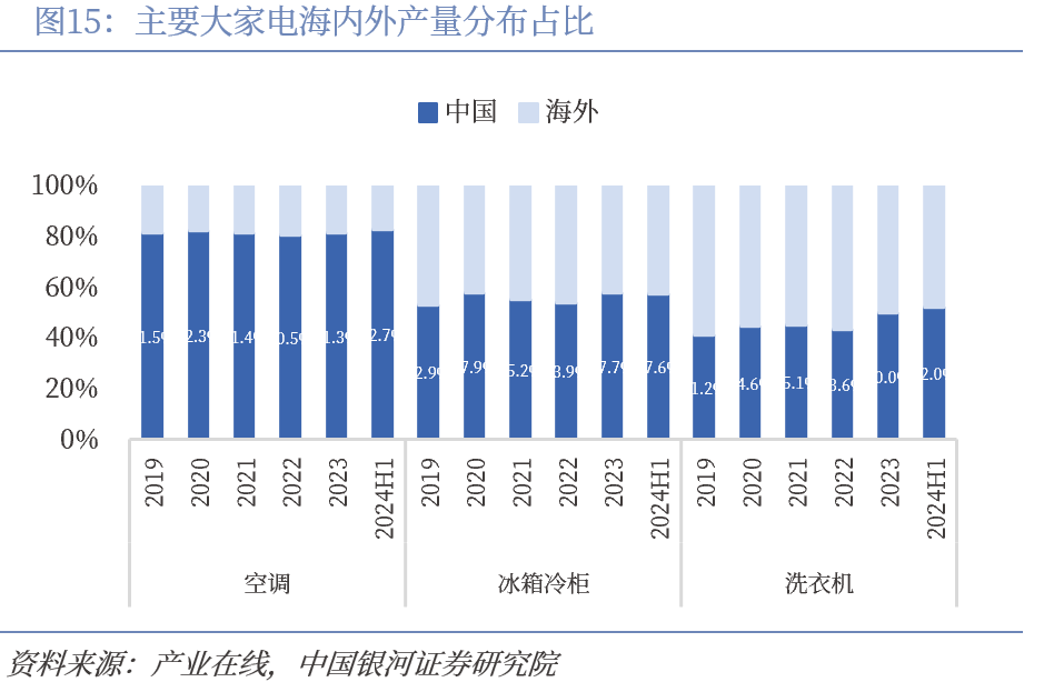 大家电运输范围有限,产能迁移为出口提供保障。空调、冰箱、洗衣机、彩电、厨电等大家电体积偏大,运输成本高,运输半径有限,大家电企业为了提升生产运输和服务客户的效率,普遍选择在海外建厂生产。除海外自建厂外,企业通过收购等形式实现海外产能布局,借助当地强势品牌快速切入市场。疫情扰动全球制造业的背景下,近年来我国家电产能在全球产业链中占比稳步提升,截止2024年上半年末,我国空调、冰箱冷柜、洗衣机产能分别占全球的82.7%、57.6%和52%,随着全球贸易恢复,产能迁移具备良好基础。