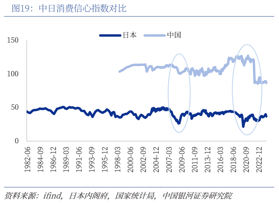 消费环境方面,人口增速见顶导致消费群体扩张停滞,经济环境复杂背景下消费信心疲弱。日本人口增速由1960年的0.89%升至1971年的2.19%后见顶,之后基本保持下降趋势,1977年便降至1%以下,随后在2010年左右转为负值。反观我国人口年增长率于1998年降至1%以下,2022年降低至-0.01%,人口年增长率与日本1997-2010年这一时期相似度较高。消费信心方面,中日两国均经历了消费信心触顶回落:1982年至1989年,日本消费信心指数由47.3升至50.60,随后持续震荡下降,我国2018年后的情况与之类似,此后日本消费信心指数始终徘徊在50以下。从消费信心波动的情况来看,中日两国作为全球制造大国,经济发展受到全球需求影响,2008年金融危机、新冠疫情、美联储宣布加息等全球事件均对两国消费信心冲击,消费信心波动情况相似。