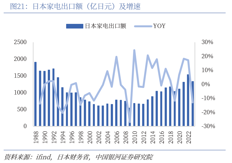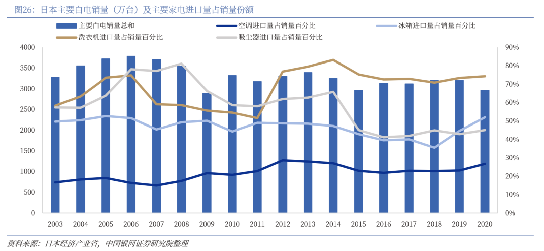 国内市场饱和叠加产品技术拥有优势,日本家电产能逐步外溢。根据日本经济产业省数据,空调、冰箱、洗衣机本土年产量由2003年的2112.62万台、285.90万台、313.27万台缩减至2020年的1752.31万台、132.06万台、84.09万台,本土产能明显下滑,进口量占本土销量的百分比分别从2003年的16.68%、49.62%、58.38%提升至2020年的26.62%、52.07%、74.43%,进口占销量份额不同程度增加。我们认为,早期日本家电产业核心技术要素优势显著,产能主要集中于本土,随着经济发展和家电产业技术具备领先优势后,领先家电企业逐渐将产能迁移至劳动、土地等生产要素禀赋富足的海外地区,充分发挥当地资源的成本优势,在当地生产加工的家电成品后角逐于海外市场。2000年后随着我国家电制造的崛起,日本本土家电市场对进口依赖度逐步提升。