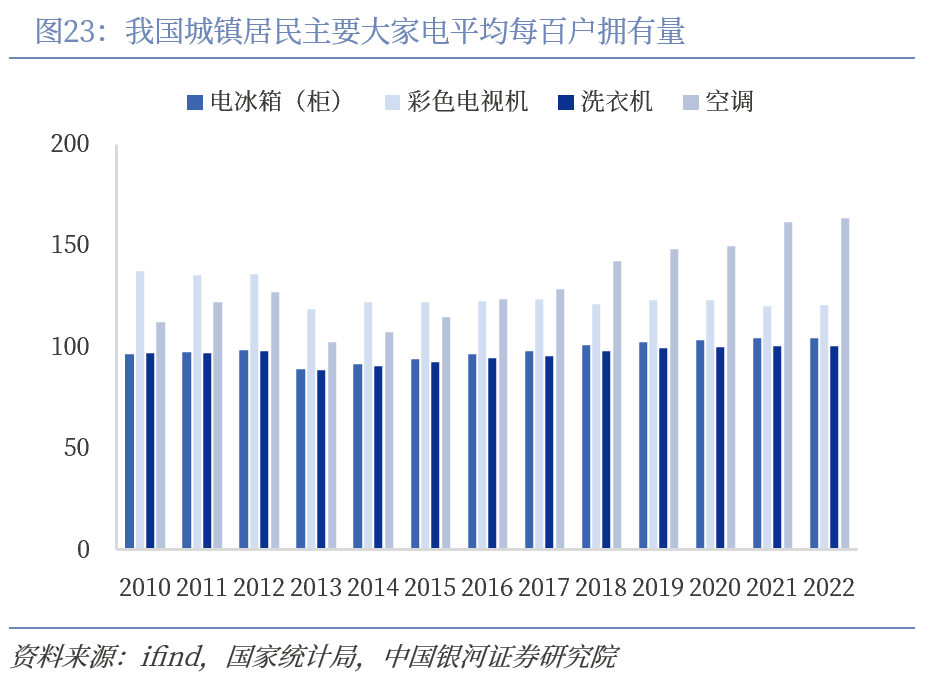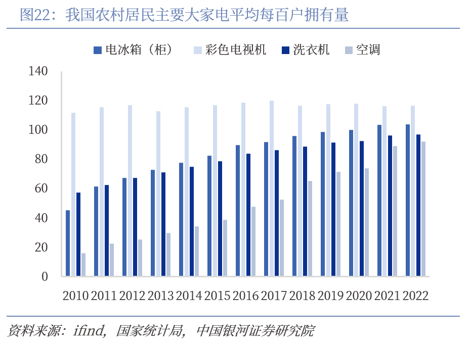 对比国内,我国主要大家电趋于饱和。2019年,我国农村居民电冰箱(柜)、彩电、洗衣机、空调平均每百户拥有量较2010年分别增长118.28%、5.16%、59.75%、345.75%,指标得到快速拉升,2019-2022年仅分别同比变动5.34、-0.94%、5.76%、29.25%,主要大家电普及速度明显放缓。
