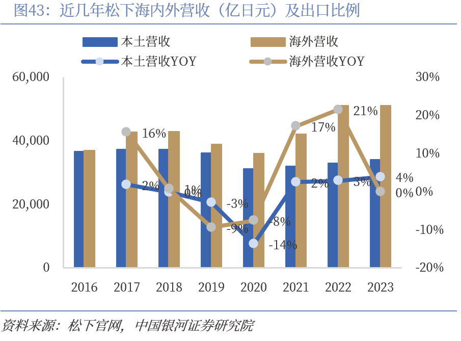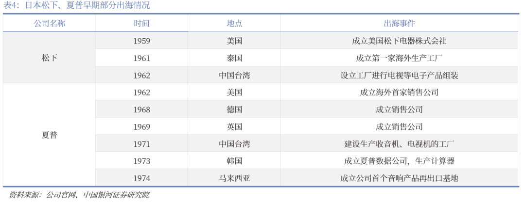 日本家电产业日益完备,产能向海外拓张。随着日本家电产业兴起,以松下、夏普为代表的家电公司逐步在日本周边国家设立新的生产基地,并通过设置海外公司提高国际化影响力。松下着力推进海外业务,制造产能逐步向海外尤其是东南亚等地转移:松下于1959年成立美国松下电器株式会社,此后在海外各地设立制造和销售基地。1961年在泰国成立第一家海外生产工厂,在巴基斯坦、南越开展电视组装业务,1962年在我国台湾设立工厂进行电视等电子产品组装。公司在1963年全部在本国生产,到2023年,松下海外收入占比已接近60%,国际化发展具备规模。借鉴松下成功经验,夏普于1962年在美国成立海外首家销售公司,并分别于1968年和1969年在德国和英国成立销售公司。为应对美国经济和美元贬值政策,解决贸易摩擦,夏普决定加强海外生产,设立面向再出口的生产基地。1971年在我国台湾建设可面向美国生产的100万台收音机、30万台电视机的新工厂,1973年在韩国成立夏普数据公司,生产向美国出口的计算器,1974年在马来西亚成立公司首个真正的音响产品再出口基地。