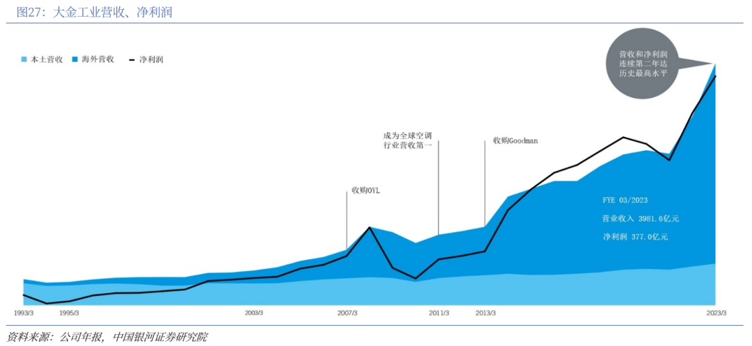 大金工业成立于1924年,是全球领先的暖通空调及氟化工跨国企业。回顾日本家电兴衰史,昔日巨头东芝、松下、夏普等企业或是被收购,或是逐步收缩家电业务,大金却能屹立不倒,自上世纪90年代以来十数倍级增长,其主要的增长便是海外市场的布局扩张。历经以OYL、Goodman为代表的并购扩张,大金海外营收突飞猛进,其年均增速远超日本本土市场,净利润也与之同步跃升。正是全球化的战略布局与海外市场的并购扩张策略,大金在空调市场经久不衰,保持世界空调领导者地位。