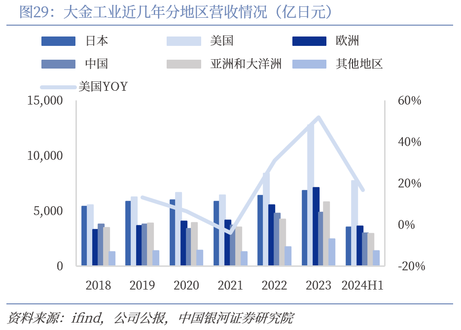 回顾大金成长历程不难发现,公司持续巩固中央空调领域核心竞争力,并将出口成功经验灵活复制到不同市场,是其国际化成功的关键。1951年大金第一台商用柜式空调诞生,开启商用空调时代,1958年1958年推出日本首台配备旋转式压缩机的窗式空调,正式进入家用空调市场,1969年大金第一台多管制家用多练空调问世,家用中央空调文化诞生,1978年发明跨时代意义的天花板嵌入式室内机,1982年大金第一台VRV空调系统诞生,开创楼宇用多联空调系统新时代。大金主业空调业务2019-2023年及2024年H1营收分别为22228.87、23099.87、22754.98、28306.66、36319.23、20568.42亿日元,空调主业常年贡献90%以上营收,2022年/2023年/2024年H1空调业务收入同比分别增长24.4%、28.31%、10.86%,成长弹性较高。公司持续深耕空调领域,专注将主业做大做强,强大的技术实力和成熟的国际化管理经验为其开拓海外市场奠定了坚实基础。