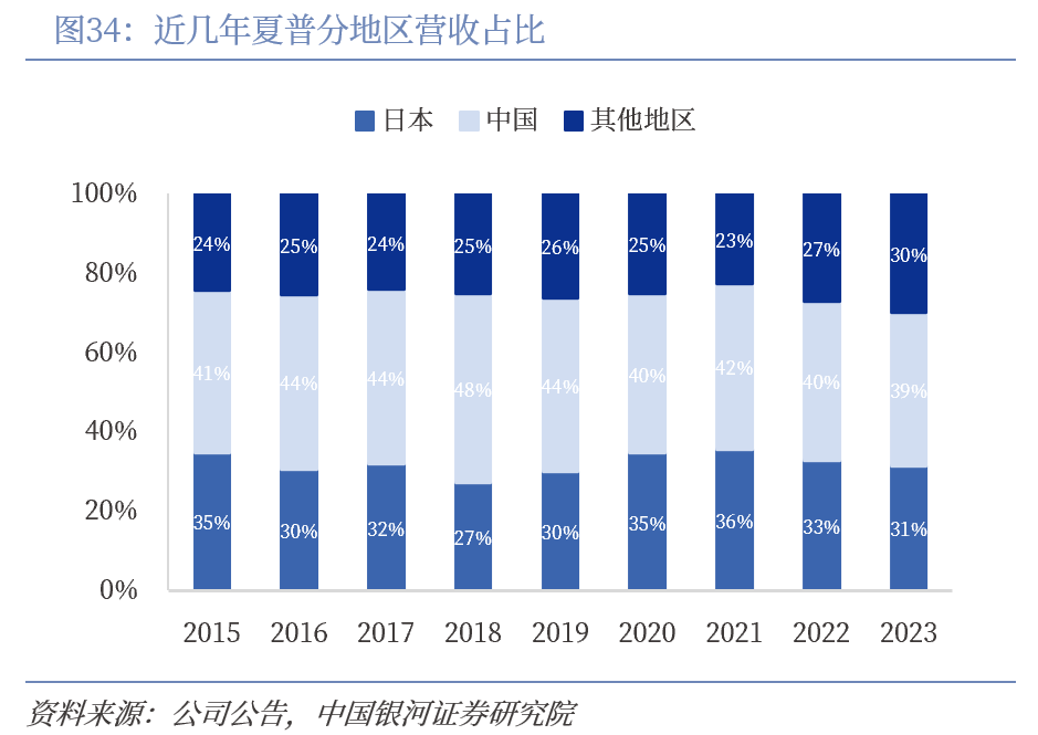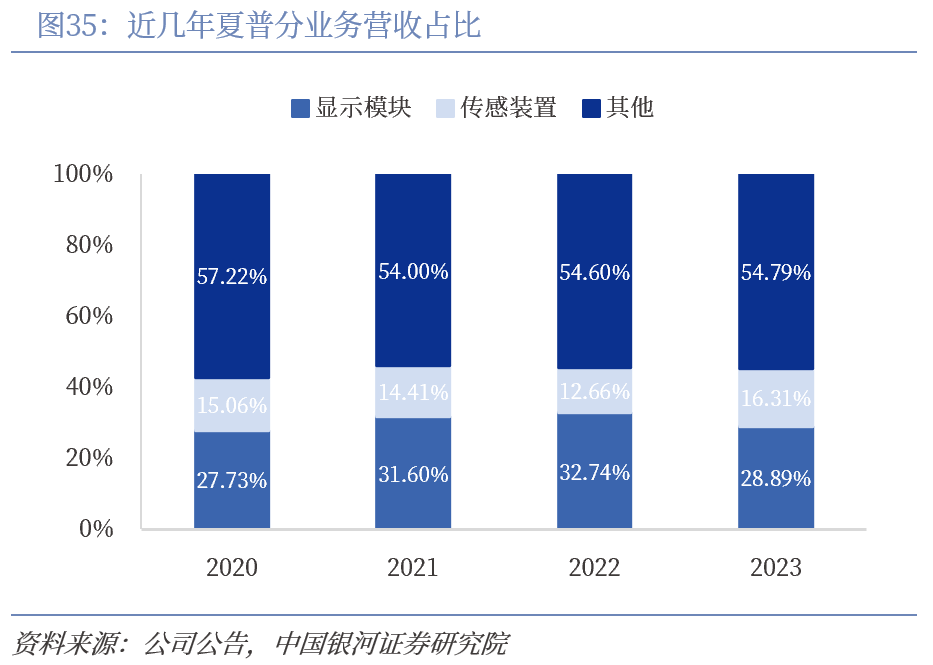 夏普海外产能快速扩张,营收占比提升显著。夏普于1962年在美国成立海外首家销售公司,先后在德国、英国、澳大利亚、韩国等国成立销售公司。为应对美国经济和美元贬值政策,解决贸易摩擦,夏普决定加强海外生产,设立面向再出口的生产基地。1971年在我国台湾建设可面向美国生产的100万台收音机、30万台电视机的新工厂,1973年在韩国成立夏普数据公司,生产向美国出口的计算器,1974年在马来西亚成立公司首个真正的音响产品再出口基地。截止2023年,公司海外营收占总营收比例达68.59%。但分地区来看,单中国市场就贡献了夏普40%收入,是最重要的海外市场,欧美等国家贡献度增长不明显。分业务来看,夏普显示模块业务占比最大,约占总营收的55%,近几年业务比例保持稳定。