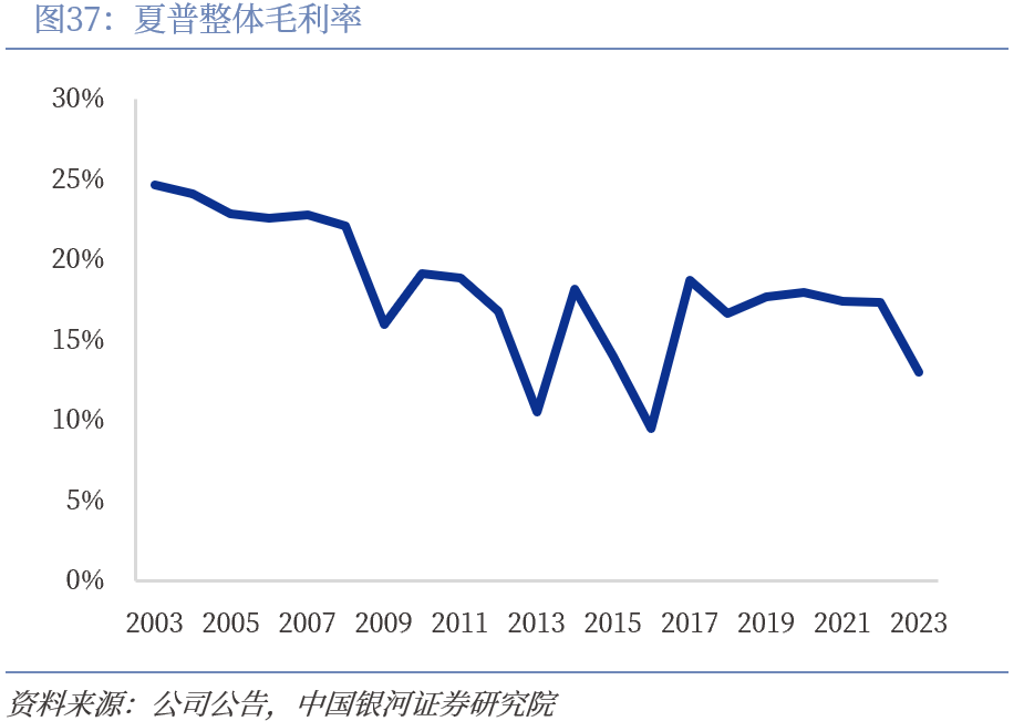 作为液晶电视领导者,市场竞争加剧导致产品毛利率薄弱。2003年开始,液晶电视在中国市场迎来高速增长,作为液晶霸主的夏普在液晶电视核心技术和上游液晶面板供应链上拥有明显的优势。当时夏普TFT-LCD第六代生产线投产时间远早于主要竞争对手新代产线,是同期唯一的第六代液晶面板制造商,且随着越来越多的家电企业涉足液晶电视,夏普在液晶方面的专利授权可以带来丰厚盈利。2016年夏普在被收购后,面对激烈的市场竞争和逐步萎缩的需求,采取了低价竞争抢夺市场份额的策略,透支了多年来夏普塑造的高端品牌价值,业绩压力较大。近年来,随着三星、LG等韩企扩张液晶面板产业,叠加夏普自身在太阳能电池业务连续亏损、手机业务表现不佳等业务调整部署的不利,公司盈利能力振荡下滑,2023年整体毛利率为12.98%,仅为二十年前的一半。
